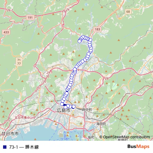 See why over 2 million users trust and consider busmaps.com as the best public transport website. busmaps gives you Hiroshima Buses suggested routes, real-time bus tracker, line route maps in Hiroshima, and helps to find the closest 73-1 bus stops near you. No internet available? Download an offline PDF map and bus schedule for the 73-1 bus to take on your trip.