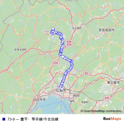 The first stop of the 73-9 bus route is 広島バスセンター and the last stop is 琴谷車庫. 73-9 (豊平・琴谷線/今吉田線) is operational during 毎日.