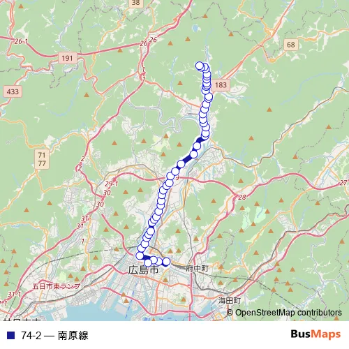 See why over 2 million users trust and consider busmaps.com as the best public transport website. busmaps gives you Hiroshima Buses suggested routes, real-time bus tracker, line route maps in Hiroshima, and helps to find the closest 74-2 bus stops near you. No internet available? Download an offline PDF map and bus schedule for the 74-2 bus to take on your trip.