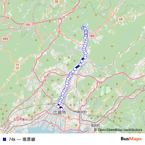 See why over 2 million users trust and consider busmaps.com as the best public transport website. busmaps gives you Hiroshima Buses suggested routes, real-time bus tracker, line route maps in Hiroshima, and helps to find the closest 74k bus stops near you. No internet available? Download an offline PDF map and bus schedule for the 74k bus to take on your trip.