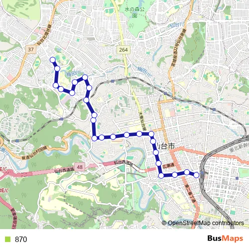 See why over 2 million users trust and consider busmaps.com as the best public transport website. busmaps gives you Sendai Buses suggested routes, real-time bus tracker, line route maps in Sendai, and helps to find the closest 870 bus stops near you. No internet available? Download an offline PDF map and bus schedule for the 870 bus to take on your trip.