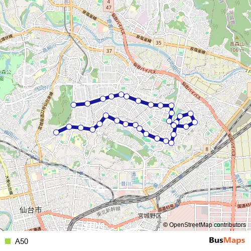 See why over 2 million users trust and consider busmaps.com as the best public transport website. busmaps gives you Sendai Buses suggested routes, real-time bus tracker, line route maps in Sendai, and helps to find the closest A50 bus stops near you. No internet available? Download an offline PDF map and bus schedule for the A50 bus to take on your trip.