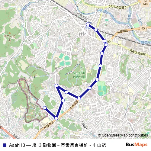 The first stop of the Asahi13 bus route is ヨコハマドウブツエン and the last stop is ナカヤマエキ. Asahi13 (旭13 動物園~市営集会場前~中山駅) is operational during 毎日.