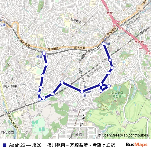 The first stop of the Asahi26 bus route is キボウガオカエキ and the last stop is フタマタガワエキミナミグチ. Asahi26 (旭26 二俣川駅南~万騎循環~希望ヶ丘駅) is operational during 毎日.