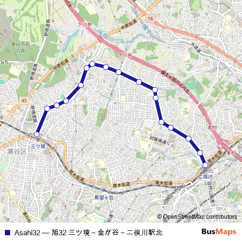 The first stop of the Asahi32 bus route is ミツキョウエキ and the last stop is フタマタガワエキキタグチ. Asahi32 (旭32 三ツ境~金が谷~二俣川駅北) is operational during 毎日.