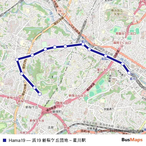 The first stop of the Hama19 bus route is ホシカワエキ and the last stop is シンサクラガオカダンチ. Hama19 (浜19 新桜ケ丘団地~星川駅) is operational during 毎日.