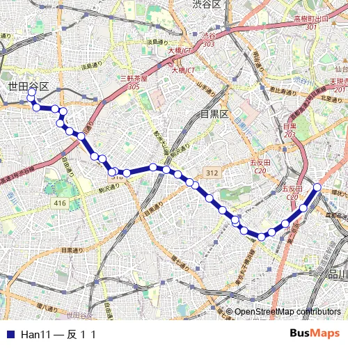 The first stop of the Han11 bus route is ゴタンダエキ and the last stop is セタガヤクミンカイカン. Han11 (反11) is operational during 毎日.