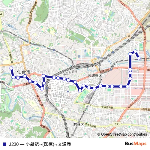 The first stop of the J230 bus route is 小鶴新田駅 and the last stop is 交通局東北大学病院前. J230 (小新駅→(医療)→交通局) is operational during 毎日.