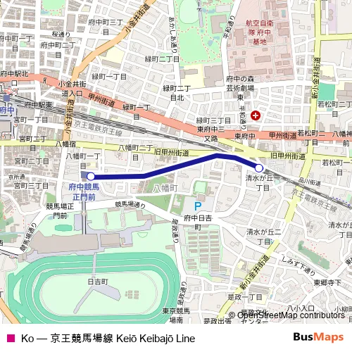 The first stop of the Ko rail route is 府中競馬正門前 and the last stop is 東府中. Ko (京王競馬場線) is operational during 毎日.