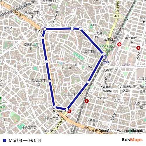 The first stop of the Mori08 bus route is オオモリエキ and the last stop is オオモリエキ. Mori08 (森08) is operational during 毎日.
