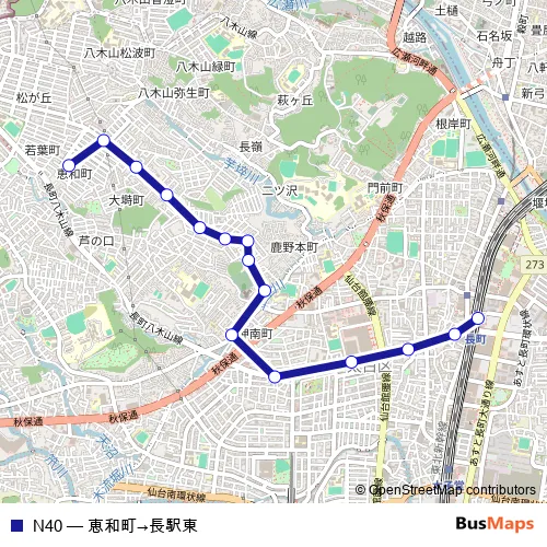The first stop of the N40 bus route is 長町駅東口 and the last stop is 恵和町. N40 (恵和町→長駅東) is operational during 毎日.