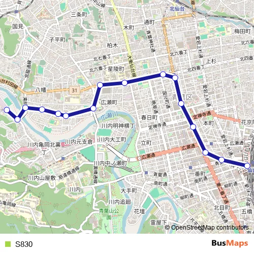 The first stop of the S830 bus route is 市営バス川内営業所前 and the last stop is 仙台駅前. S830 is operational during 毎日.