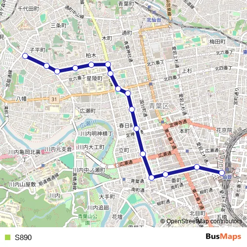 The first stop of the S890 bus route is 子平町・壽徳寺前 and the last stop is 仙台駅前. S890 is operational during 毎日.