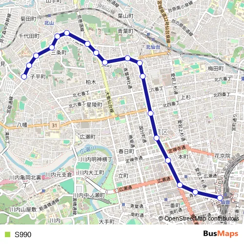 The first stop of the S990 bus route is 子平町・壽徳寺前 and the last stop is 仙台駅前. S990 is operational during 毎日.
