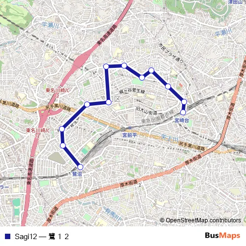 The first stop of the Sagi12 bus route is ミヤザキダイエキ and the last stop is サギヌマエキ. Sagi12 (鷺12) is operational during 毎日.
