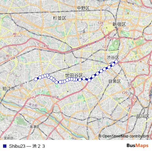 The first stop of the Shibu23 bus route is シブヤエキ and the last stop is ソシガヤオオクラエキ. Shibu23 (渋23) is operational during 毎日.