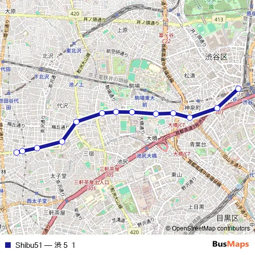 The first stop of the Shibu51 bus route is ワカバヤシオリカエシジョ and the last stop is シブヤエキ. Shibu51 (渋51) is operational during 毎日.
