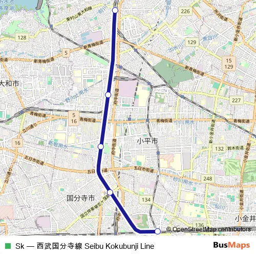 The first stop of the Sk rail route is 国分寺 and the last stop is 東村山. Sk (西武国分寺線) is operational during 毎日.