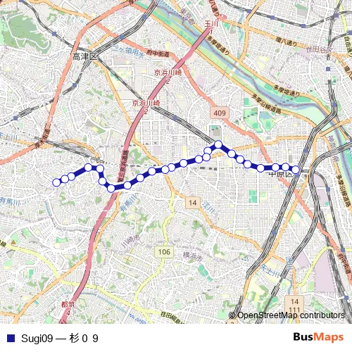 The first stop of the Sugi09 bus route is コスギエキマエ and the last stop is ノガワダイコウエンマエ. Sugi09 (杉09) is operational during 毎日.