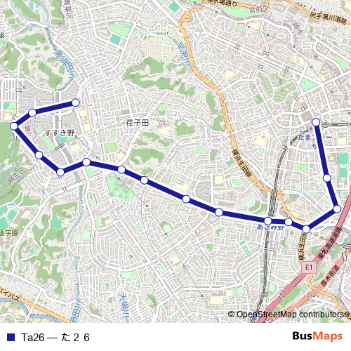 The first stop of the Ta26 bus route is タマプラーザエキ and the last stop is ススキノダンチ. Ta26 (た26) is operational during 平日.