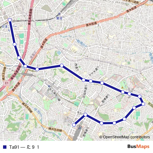 The first stop of the Ta91 bus route is タマプラーザエキ and the last stop is センターキタエキ. Ta91 (た91) is operational during 毎日.