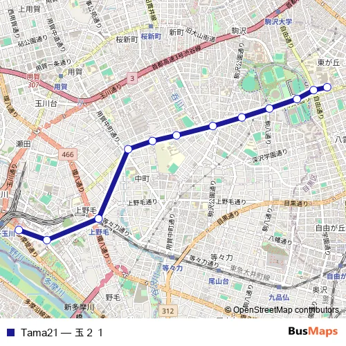 The first stop of the Tama21 bus route is トウキョウイリョウセンター and the last stop is フタコタマガワエキ. Tama21 (玉21) is operational during 毎日.
