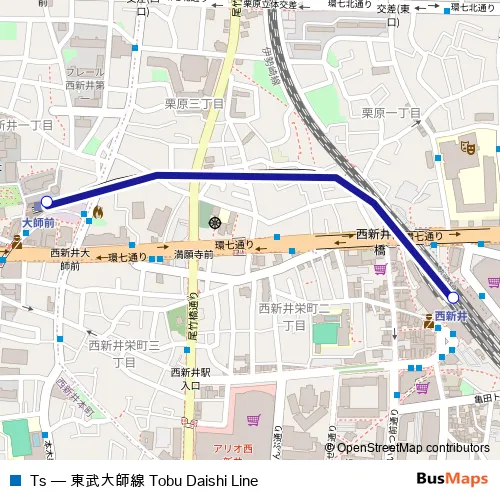 The first stop of the Ts rail route is 大師前 and the last stop is 西新井. Ts (東武大師線) is operational during 毎日.