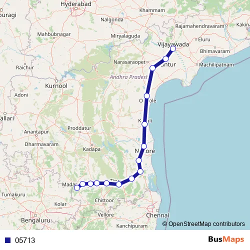 The first stop of the 05713 bus route is Madanapally and the last stop is
