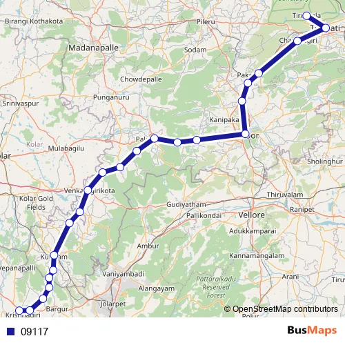The first stop of the 09117 bus route is Krishna Giri and the last stop is