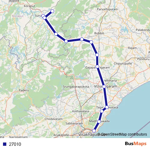 The first stop of the 27010 bus route is Visakhapatnam and the last stop is