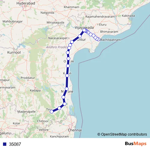 The first stop of the 35087 bus route is Machilipatnam and the last stop is