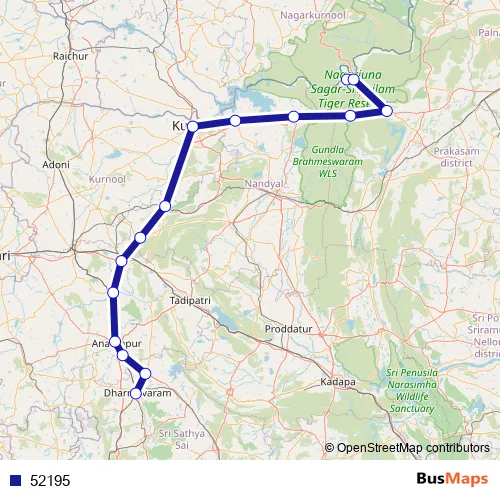 The first stop of the 52195 bus route is Srisailam and the last stop is