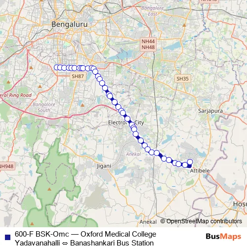 ಆಕ್ಸ್ ಫರ್ಡ್ ವೈದ್ಯಕೀಯ ಕಾಲೇಜು ಯಡವನಹಳ್ಳಿ (ಟುವರ್ಡ್ಸ್ ಯಡವನಹಳ್ಳಿ). 600-F BSK-Omc (Oxford Medical College Yadavanahalli ⇔ Banashankari Bus Station) is operational during ಪ್ರತಿದಿನ.