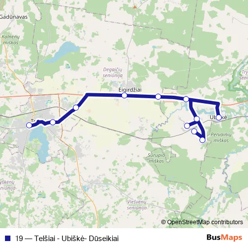 The first stop of the 19 bus route is Ubiškės and the last stop is Telšių autobusų stotis. 19 (Telšiai - Ubiškė- Dūseikiai) is operational during kasdien.