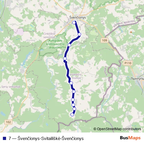 The first stop of the 7 bus route is Svitailiškė and the last stop is Švenčionių autobusų stotis. 7 (Švenčionys-Svitailiškė-Švenčionys) is operational during darbo dienomis.