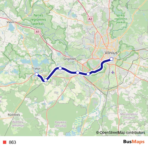 The first stop of the 863 rail route is Vilnius and the last stop is Trakai. 863 is operational during savaitgaliais.