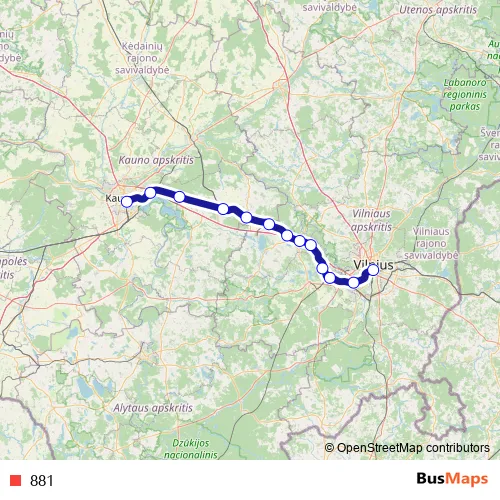 The first stop of the 881 rail route is Vilnius and the last stop is Kaunas. 881 is operational during kasdien.