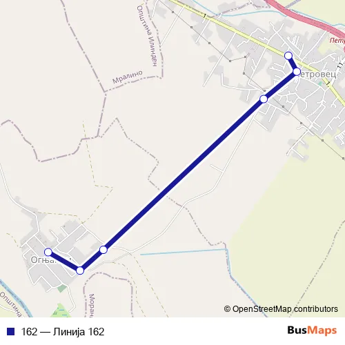 The first stop of the 162 bus route is Огњанци Т and the last stop is Петровец Црква-КОН Центар. 162 (Линија 162) is operational during секој ден.