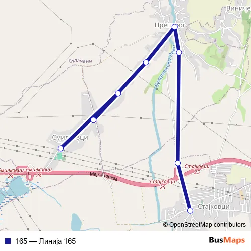 The first stop of the 165 bus route is Смилковци Т and the last stop is Стајковци ОУ Кирил И Методиј-КОН Чентоg. 165 (Линија 165) is operational during секој ден.