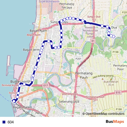 The first stop of the 604 bus route is Hub Desa Murni and the last stop is (M1) Penang Sentral. 604 is operational during setiap hari.