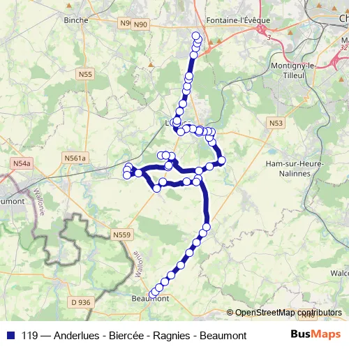 The first stop of the 119 bus route is Beaumont Athénée and the last stop is Anderlues Jonction. 119 (Anderlues - Biercée - Ragnies - Beaumont) is operational during op werkdagen.