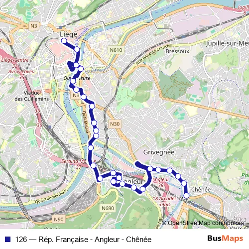 The first stop of the 126 bus route is Chenee Gare and the last stop is Liege République Française - Quai A. 126 (Rép. Française - Angleur - Chênée) is operational during op werkdagen.