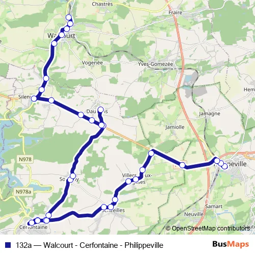 The first stop of the 132a bus route is Philippeville Centre - Quai 3 and the last stop is Walcourt Gare. 132a (Walcourt - Cerfontaine - Philippeville) is operational during dagelijks.
