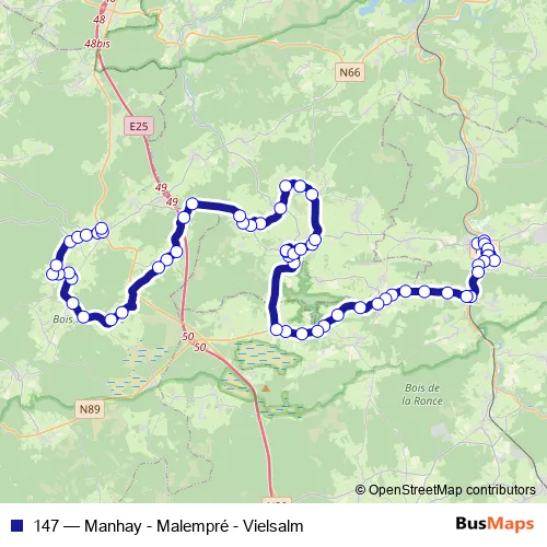 The first stop of the 147 bus route is Rencheux Ecole and the last stop is Manhay Dépôt Tec. 147 (Manhay - Malempré - Vielsalm) is operational during op werkdagen.