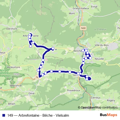The first stop of the 149 bus route is Rencheux Ecole and the last stop is Menil Carrefour. 149 (Arbrefontaine - Bêche - Vielsalm) is operational during op werkdagen.