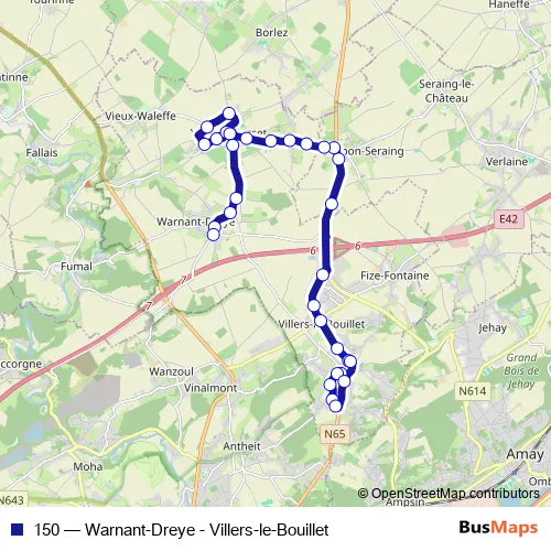 The first stop of the 150 bus route is Villers-LE-Bouillet Gotroulle and the last stop is Warnant-Dreye Place. 150 (Warnant-Dreye - Villers-le-Bouillet) is operational during op werkdagen.