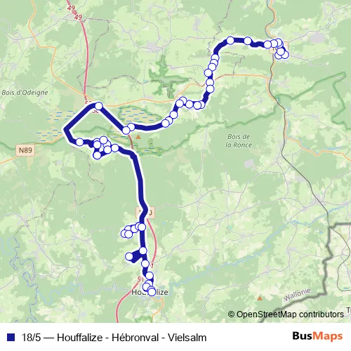 The first stop of the 18/5 bus route is Vielsalm Institut du Sacré Coeur and the last stop is Houffalize Pont. 18/5 (Houffalize - Hébronval - Vielsalm) is operational during op werkdagen.