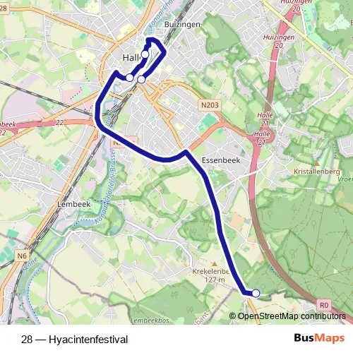 The first stop of the 28 bus route is Halle Hallerbos and the last stop is Halle Station. 28 (Hyacintenfestival) is operational during in het weekend.