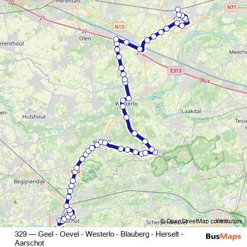 The first stop of the 329 bus route is Aarschot Bekaf and the last stop is Geel Station perron 6. 329 (Geel - Oevel - Westerlo - Blauberg - Herselt - Aarschot) is operational during op werkdagen.