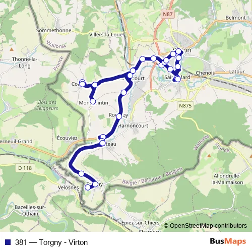 The first stop of the 381 bus route is Virton Gare and the last stop is Torgny Lavoir. 381 (Torgny - Virton) is operational during op werkdagen.